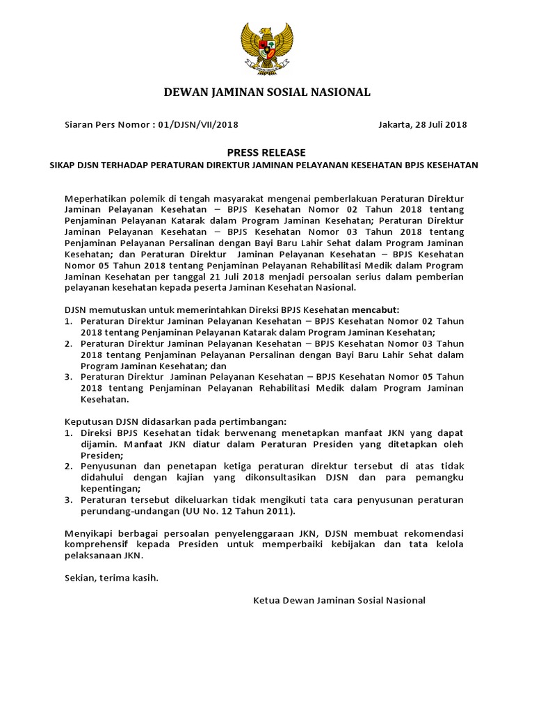 Peraturan direktur jaminan pelayanan kesehatan nomor 3 tahun 2018. KONFRONTASI- Pengurus Besar Ikatan Dokter Indonesia PB IDI menilai Peraturan Direktur Jaminan Pelayanan Kesehatan BPJS Kesehatan tentang pelayanan katarak persalinan bayi dan rehabilitasi medik merugikan pasien. NOMOR 71 TAHUN 2013 TENTANG PELAYANAN KESEHATAN PADA JAMINAN KESEHATAN NASIONAL. Tentang Pelayanan Kesehatan pada Jaminan Kesehatan Nasional Berita Negara Republik Indonesia Tahun 2013 Nomor 1400 sebagaimana telah beberapa kali diubah terakhir dengan Peraturan Menteri Kesehatan Nomor 5 Tahun 2018 tentang Perubahan Ketiga atas Peraturan Menteri Kesehatan Nomor 71 Tahun 2013 tentang Pelayanan Kesehatan pada Jaminan Kesehatan Nasional wwwperaturan.