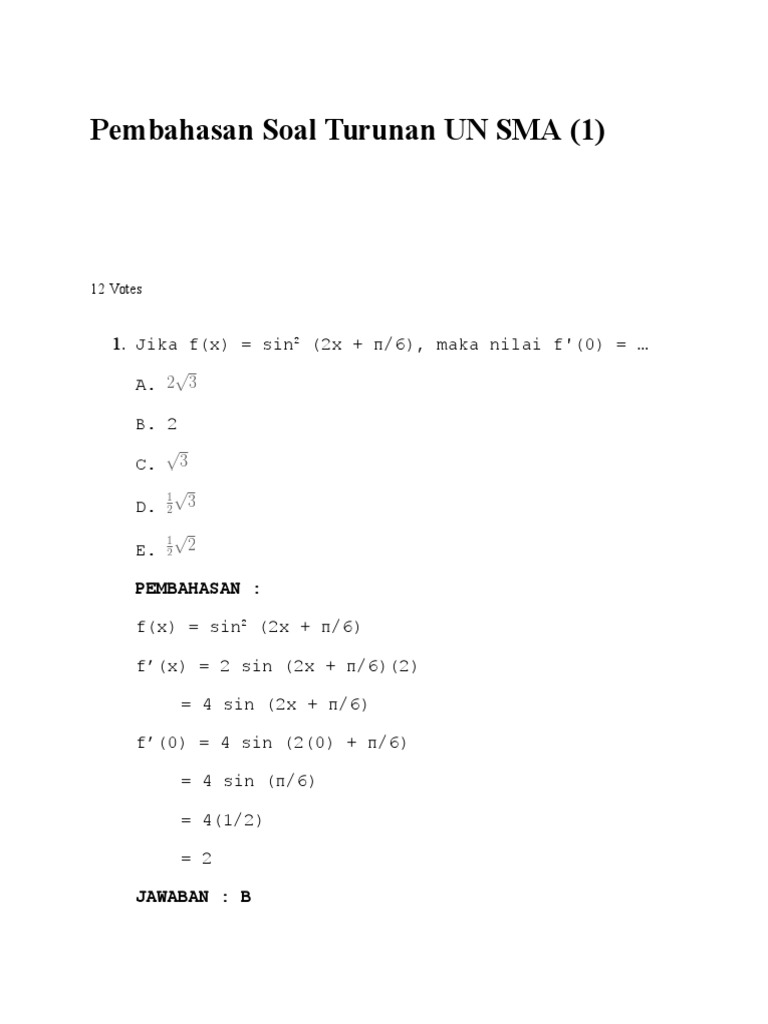 Download PDF 191 KB. Semoga bermanfaat untuk dijadikan bahan belajar. Latihan Soal Turunan Fungsi Trigonometri Bimbel Diah Kisi Kisi Soal Us Mtk Peminatan 2016 2017 Rev 3.