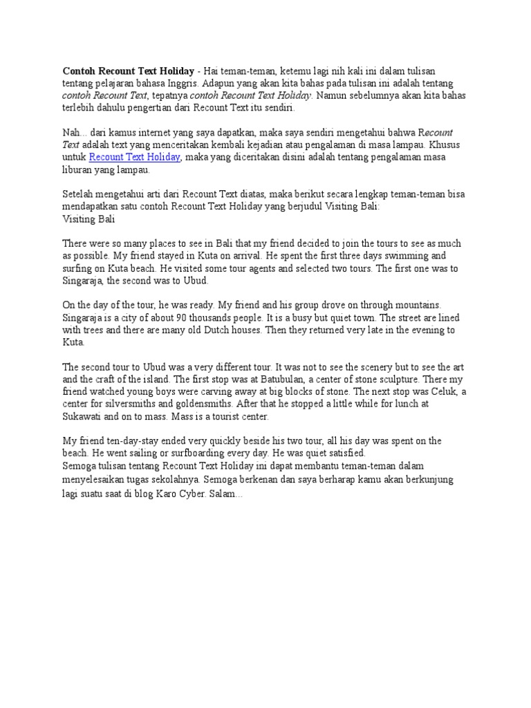 Contoh Recount Text Tentang Liburan Dalam Bahasa Inggris. He spent the first three days swimming and surfing on Kuta beach. Contoh Recount Text My Romantic Holiday Bahasa Inggris dan Artinya Kata Kata Bijak Bahasa Inggris dan Artinya.
