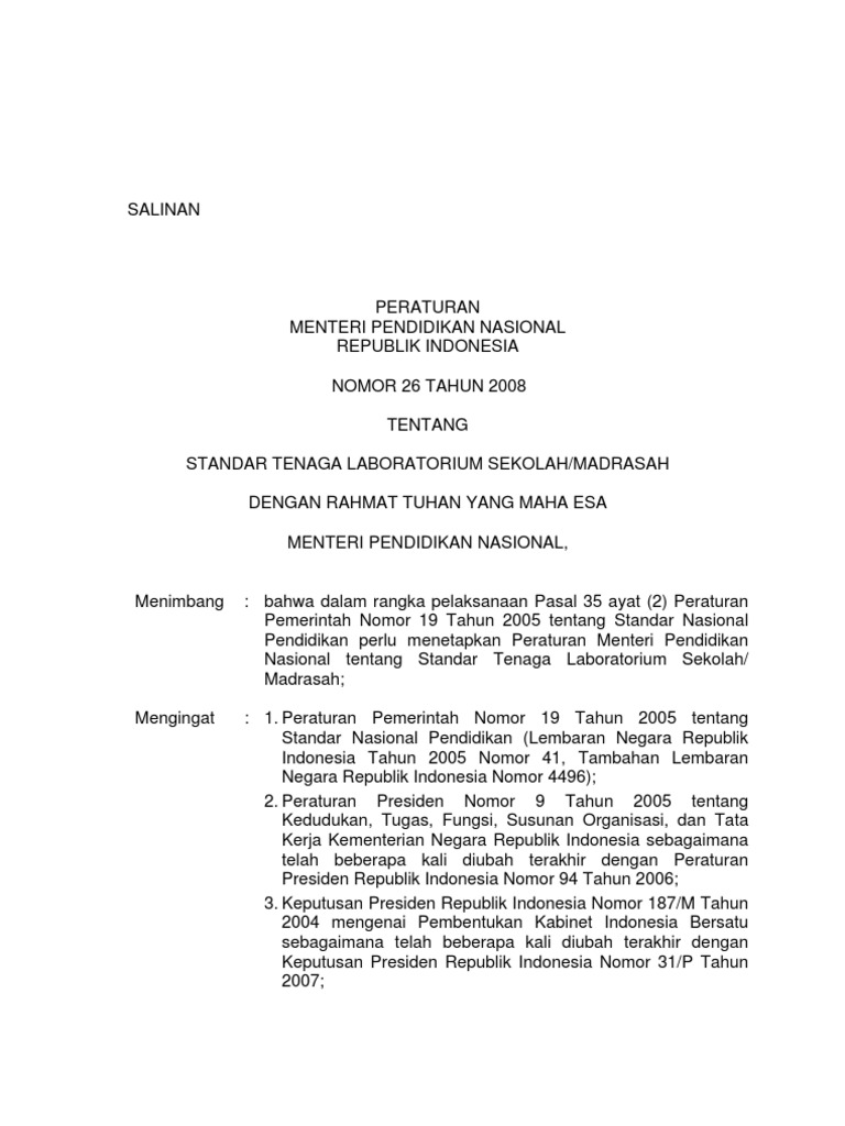 Santo Sun 28 Jan 2018 2100. Permenristekdikti Nomor 26 Tahun 2016pdf. 26 Tahun 2008 Tentang Standar Tenaga laboratorium SekolahMadrasah Posted on Agustus 27 2011 by SMK Medika Pekalongan Tenaga laboratorium sekolah merupakan salah satu tenaga kependidikan yang sangat diperlukan untuk mendukung peningkatan kualitas proses pembelajaran di sekolah melalui kegiatan laboratorium.