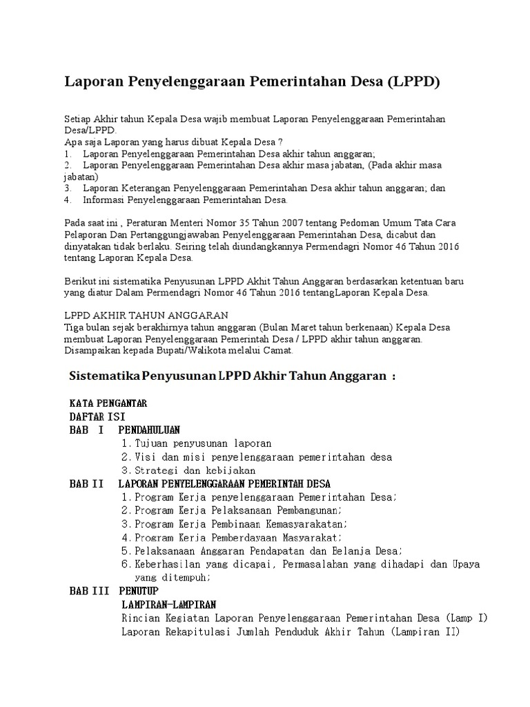 Mengacu pada Permendagri Nomor 46 Tahun 2016 tentang Laporan Kepala Desa pada pasal 3 poin 1 Laporan penyelenggaraan pemerintah Desa Akhir Tahun Anggaran disampaikan oleh kepala Desa kepada Bupatiwalikota melalui camat secara tertulis paling lambat 3 tiga bulan setelah berakhirnya tahun anggaran. Laporan Penyelenggaraan Pemerintahan Desa LPPD Desa Labbo Kecamatan Tompobulu Kabupaten Bantaeng Tahun 2016 ini merupakan bahan evaluasi dan tolok ukur dalam menentukan Rencana Kegiatan Tindak Lanjut bagi Desa Labbo khususnya dan pada umumnya sebagai bahan kebijakan Pemerintah Kabupaten Bantaeng dalam menentukan program dan kegiatan pada Tahun Anggaran. LPPD contoh LPPD Kepala Desa LKPPD Kepala Desa format word pdf excel terbaru 20212022 download file LKPJ LPPD Kepala Desa Akhir Tahun Contoh LPPD dan LKPPD Kades 20212022 Terbaru Format Word-Excel-PDF Lengkap FORMAT ADMINISTRASI DESA.