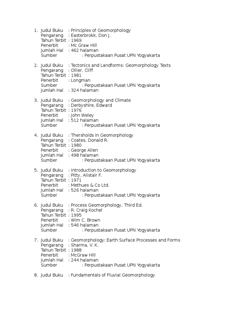 Menurut Kamus Besar Bahasa Indonesia KBBI adalah daftar yang mencantumkan judul buku nama pengarang penerbit dan sebagainya yang ditempatkan pada bagian akhir suatu karangan atau buku dan disusun berdasarkan abjad. DAFTAR KOLEKSI BUKU PRODI PENDIDIKAN FISIKA UIN SUNAN KALIJAGA per Oktober 2015 JUDUL BUKU PENGARANG PENERBIT TEMPAT THN CET KATEGORI JML HAL Analisis validitas Reliabilitas dan Interpretasi Hasil Tes. Nama penulis tahun terbit judul buku edisi ke tempat Terbit dan Penerbit.