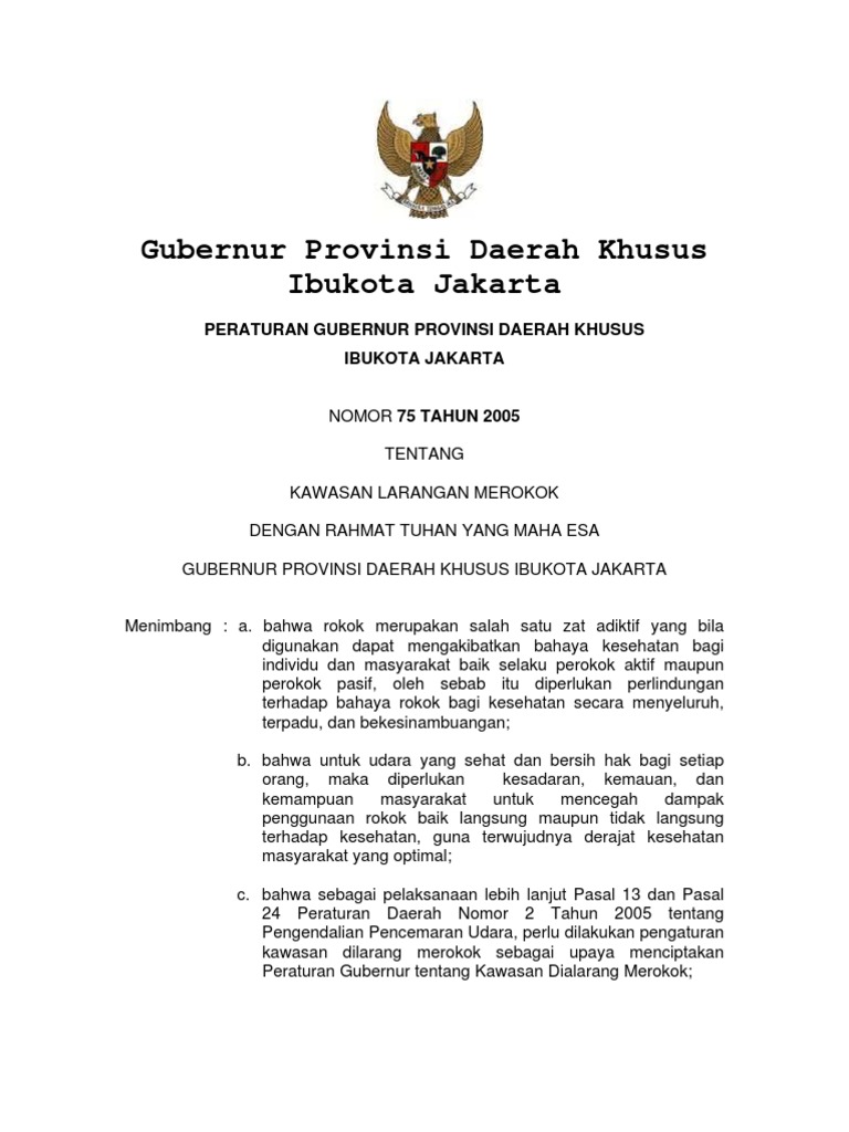 75 Tahun 2005 tentang Kawasan Dilarang Merokok sebagaimana telah diubah dengan Pergub DKI Jakarta No. Peraturan Daerah PERDA NO. Peraturan Kawasan Dilarang Merokok hanya tercantum dalam Peraturan Daerah PERDA No.