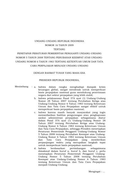 Penetapan Peraturan Pemerintah Pengganti Undang-Undang Nomor 5 Tahun 2008 tentang Perubahan Keempat Atas Undang-Undang Nomor 6 Tahun 1983 tentang Ketentuan Umum dan Tata Cara Perpajakan Menjadi Undang-Undang. 16 Tahun 2009 tentang Ketentuan Umum dan Tatacara Perpajakan UU No. 16 2009 undang-undang ketentuan umum dan tata cara perpajakan presiden republik indonesia susunan dalam satu naskah dari undang-undang republik indonesia nomor 6 tahun 1983 tentang ketentuan umum dan tata cara perpajakan sebagaimana telah beberapa kali diubah terakhir dengan undang-undang republik indonesia nomor 16 tahun 2009 berikut penjelasannya.