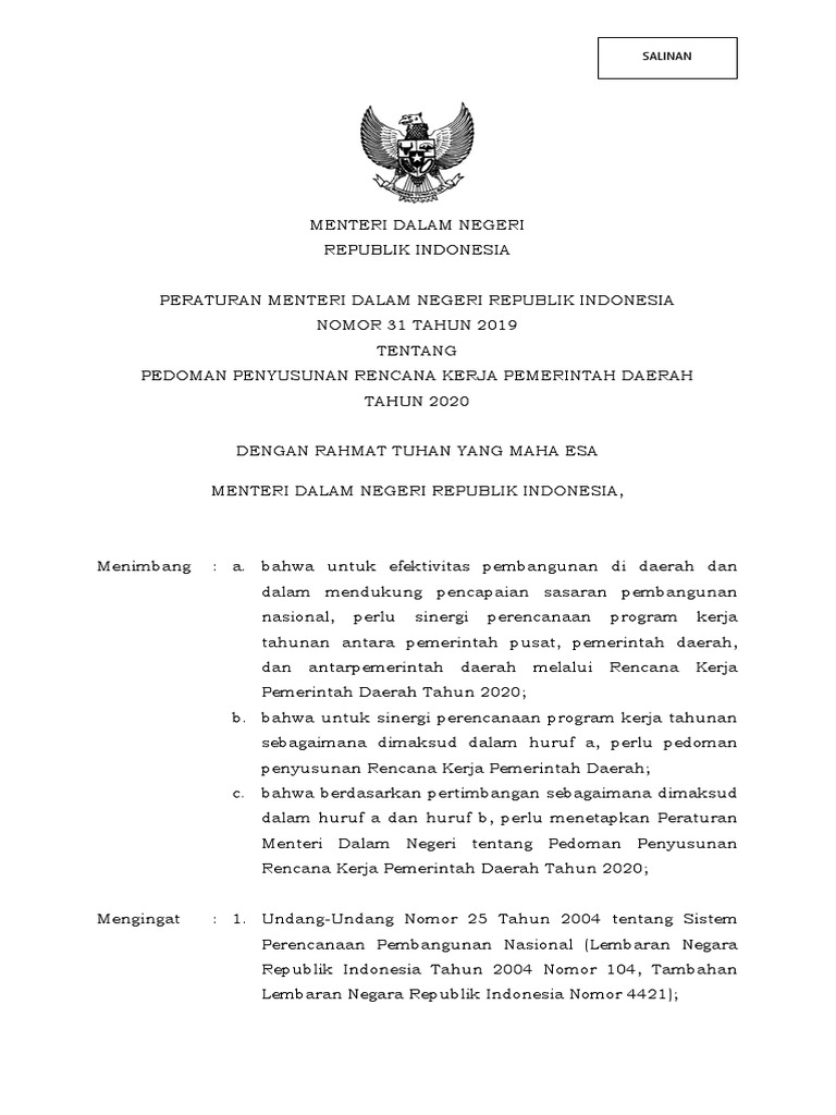Permendagri No 31 Tahun 2019 Pedoman Penyusunan Rkpd 2020 Pdf Pdf