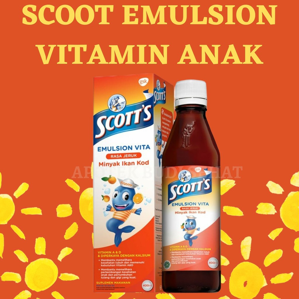 Harga Scotts Emulsion Vita Rasa Jeruk dengan Vitamin A dan D Kalsium 400ml. Scotts Emulsion adalah suplemen yang telah dipercaya selama 55 tahun untuk membantu tumbuh kembang anak Indonesia. Bahan tersebut kaya asam lemak Omega-3 vitamin A vitamin D dan kalsium.