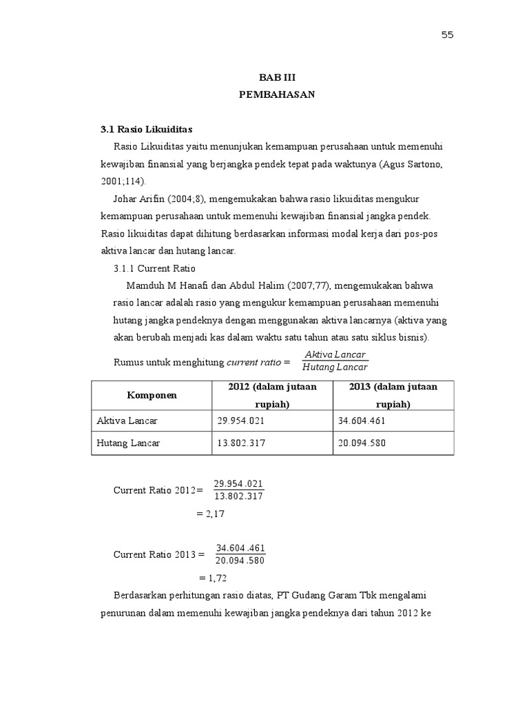 Rasio Likuiditas Keuangan PT Gudang Garam Tbk yang Terdaftar di Bursa Efek Indonesia Berdasarkan hasil analisis diperoleh bahwa dari tahun ke tahun nilai likuiditas keuangan PT Gudang Garam Tbk di bawah standar 1. Analisis Rasio Laporan Keuangan Pada PT Gudang Garam Tbk. 57 Consolidated Financial Statements Laporan Keuangan Konsolidasi s daftar isi.