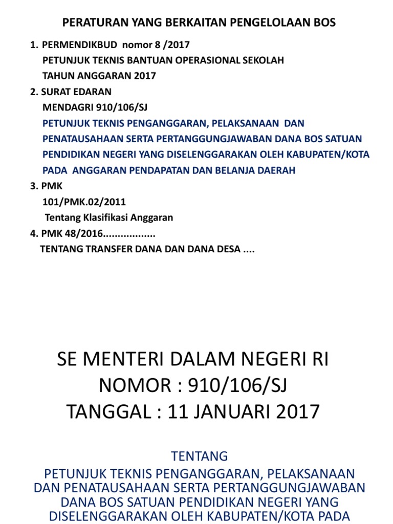 910106SJ tentang BOS Tahun Anggaran 2017 ini mengacu pada yang berikut ini seperti kami kutip. Se Mendagri Nomor 971 7791 Tahun 2018 Bos Bantuan. SE Mendagri No 910-106-SJ tentang Juknis BOS-RKAS-RKASKPDpdf.