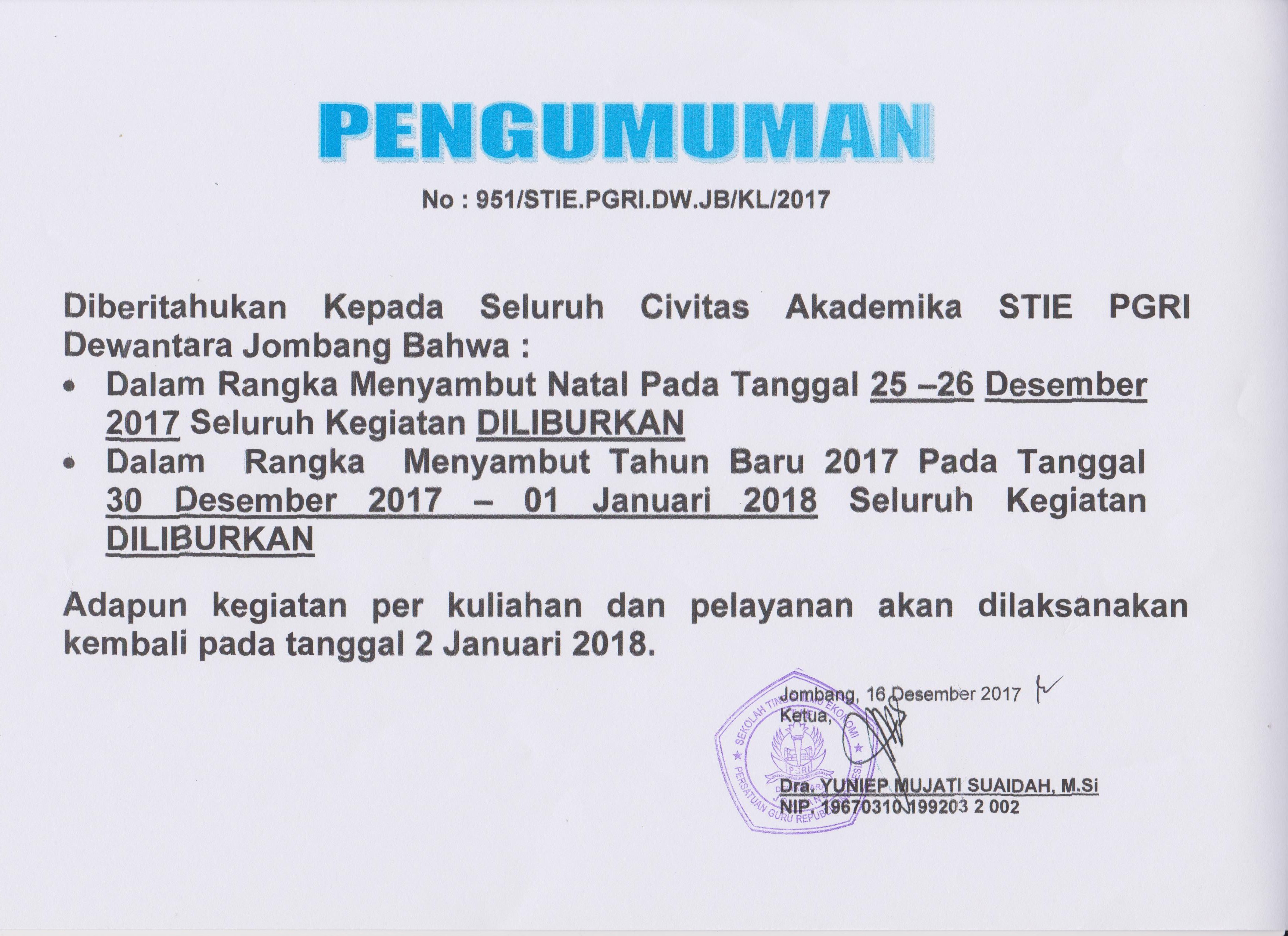Pengumuman Libur Natal Dan Tahun Baru 2019 Stie Pgri Dewantara Jombang