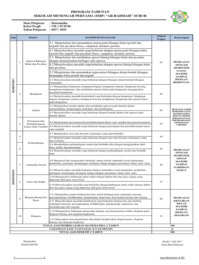 Prota Promes Matematika Smp Kelas 7 Kurikulum 2013